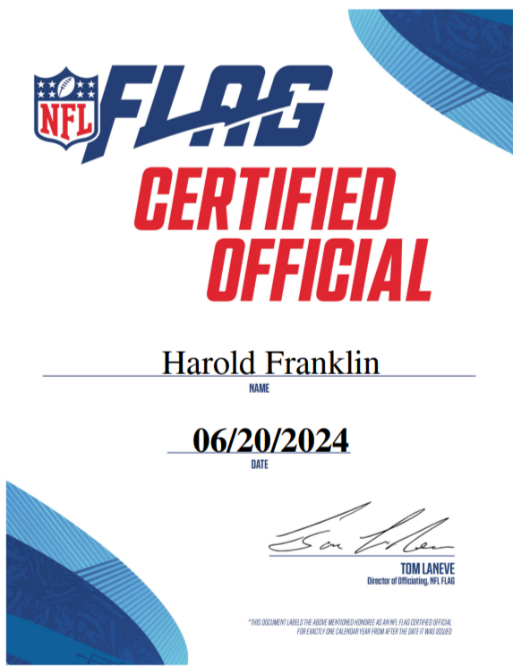 In 2024, Pastor Vincent obtained a US Center Safesport Baseball and Softball Training for Youth Sports Coaches and is now a NFL Flag Football Certified Official.